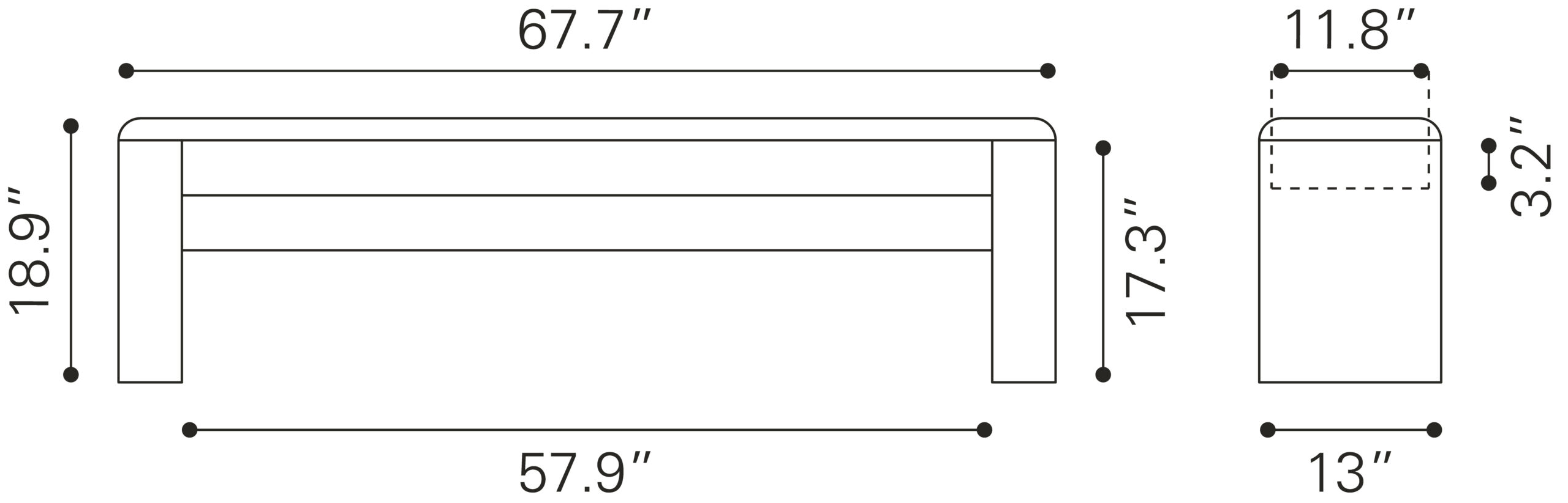 Product 1 (in) 67.7″ W x 13″ D x 18.9″ H